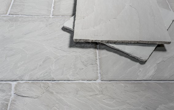 A distinctive mid to light powdery grey sandstone, with tumbled edges and a textured riven surface. Consistent in colour from tile to tile, with little variation, and its durability making it suitable for both internal and external use in a wide range of room settings.